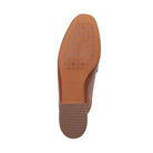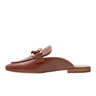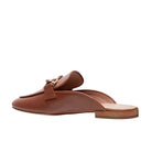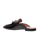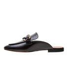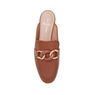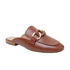 Meet ALICIA | Classic leather apron toe slip-on mule with oversized resin and gold metal chain keeper. Nicely cushioned insole and slip-resistant embossed rubber outsole.