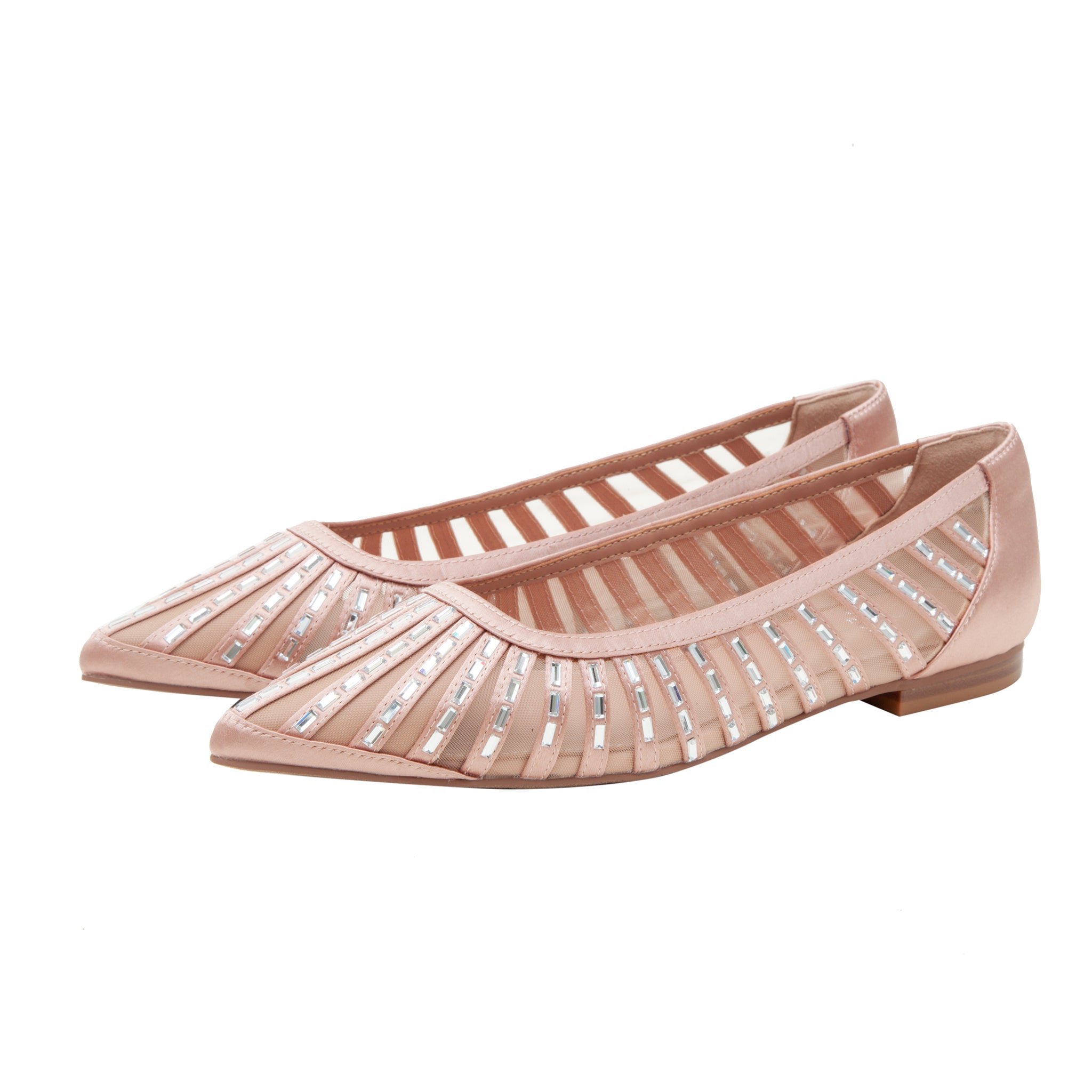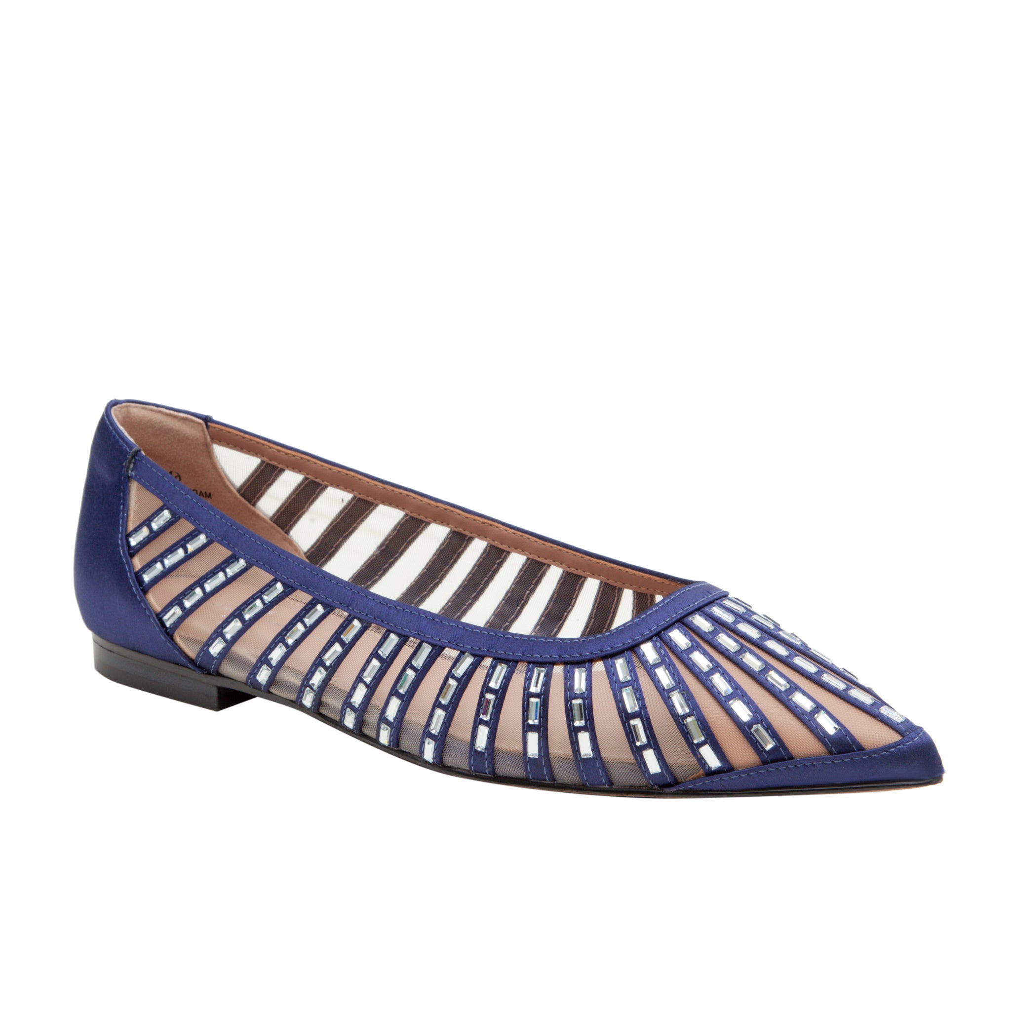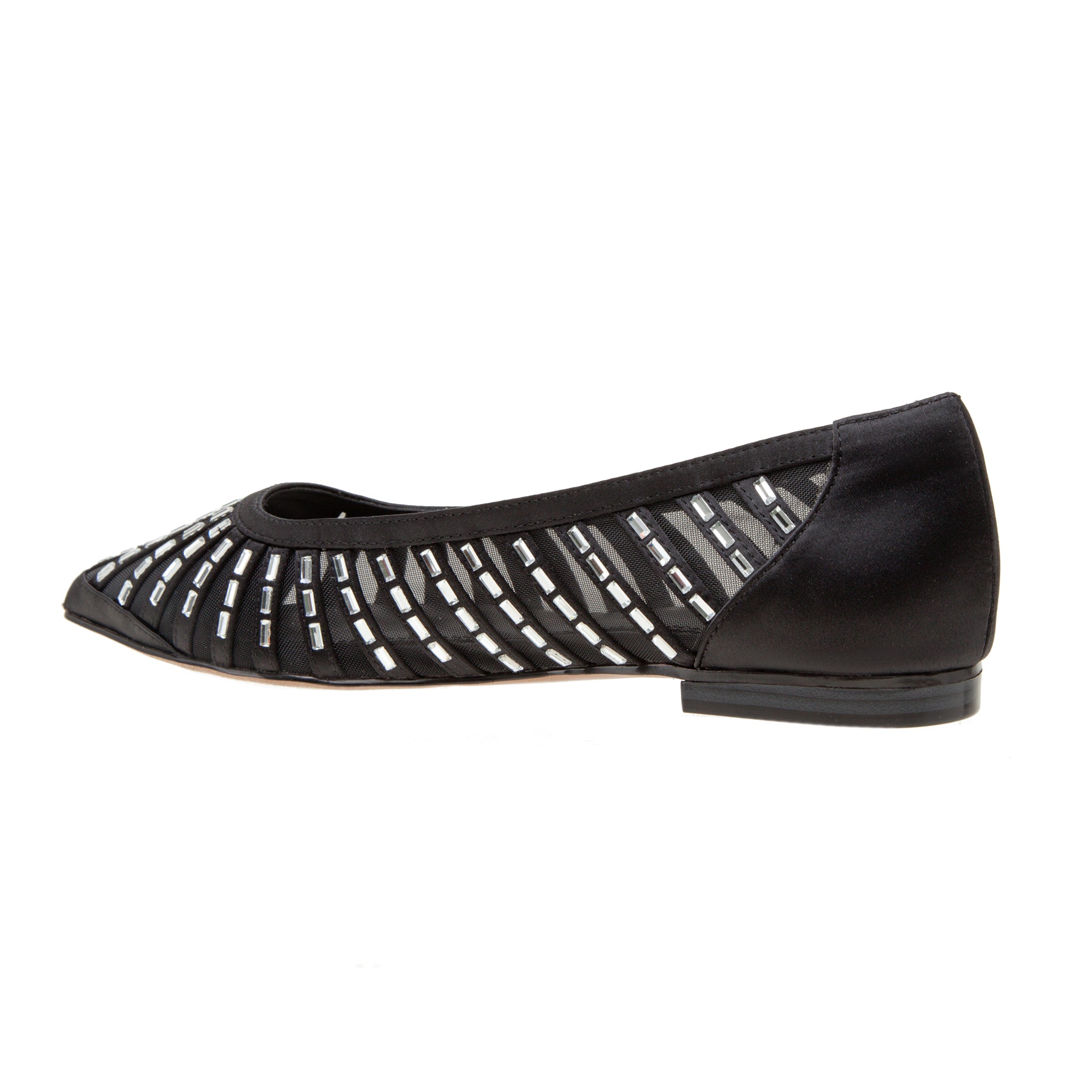 Chic and shimmery satin mesh skimmer flat with sparkling faceted crystal embellishments.