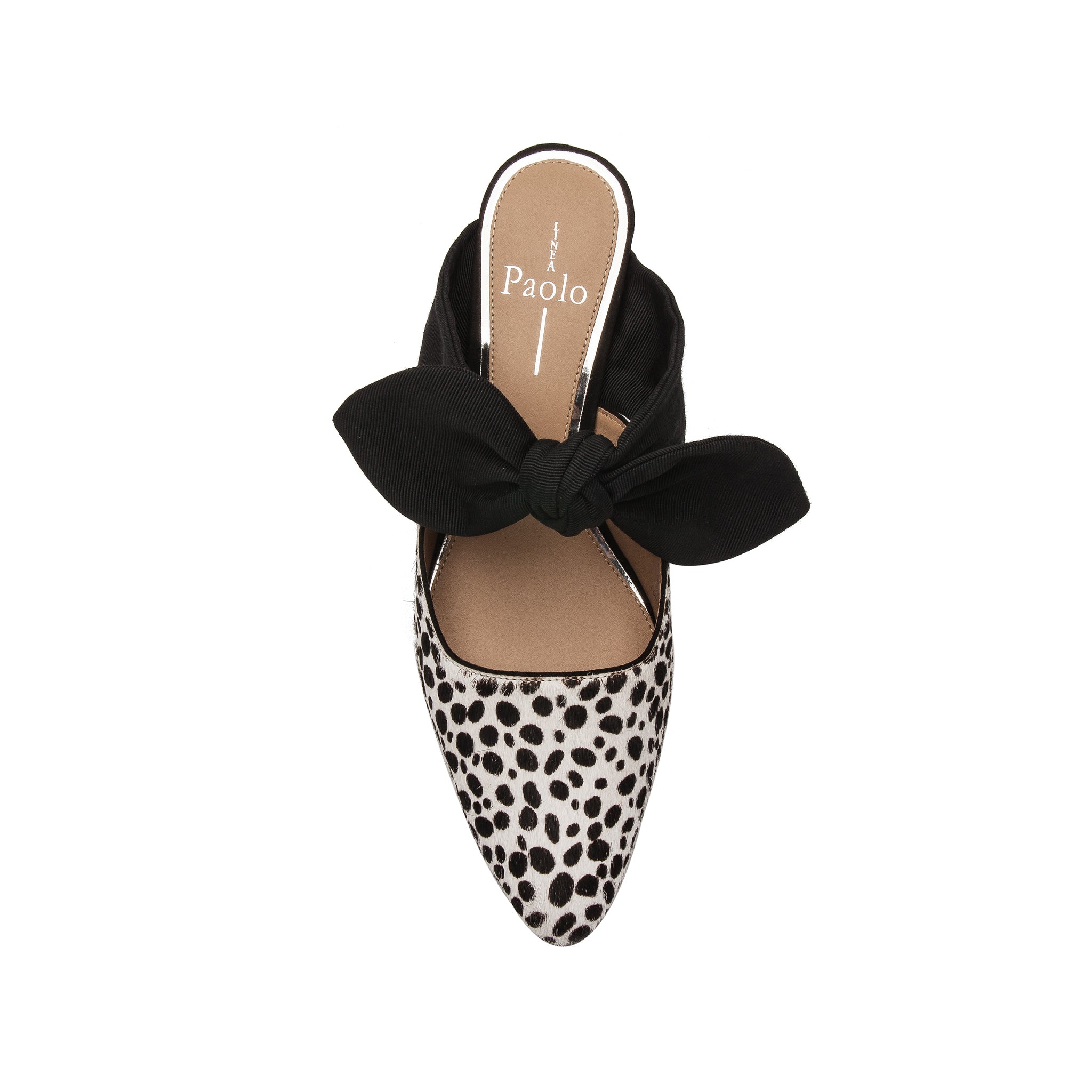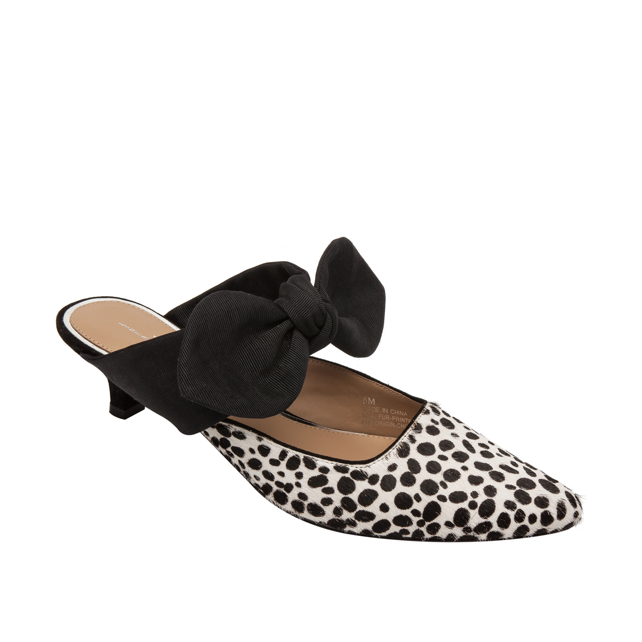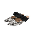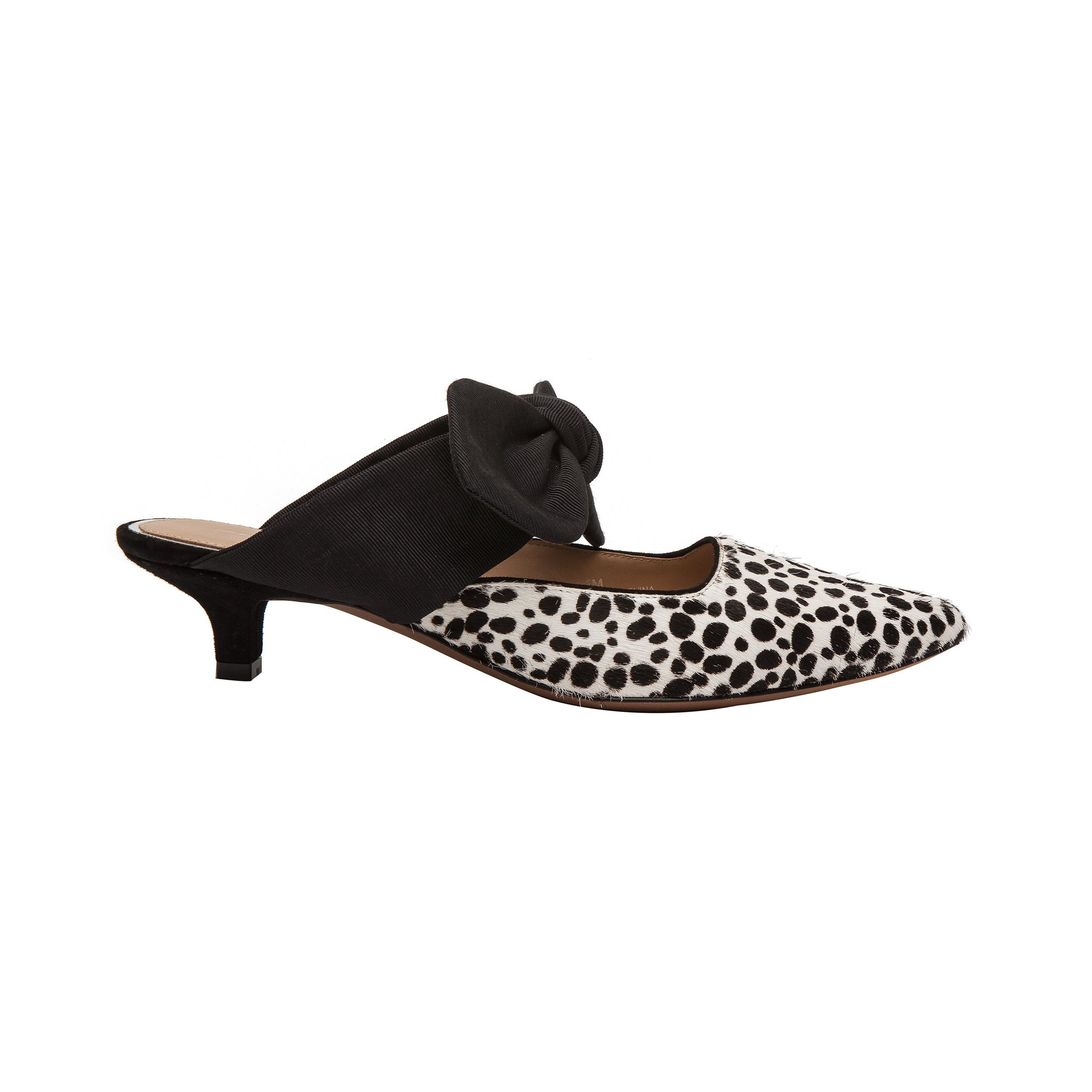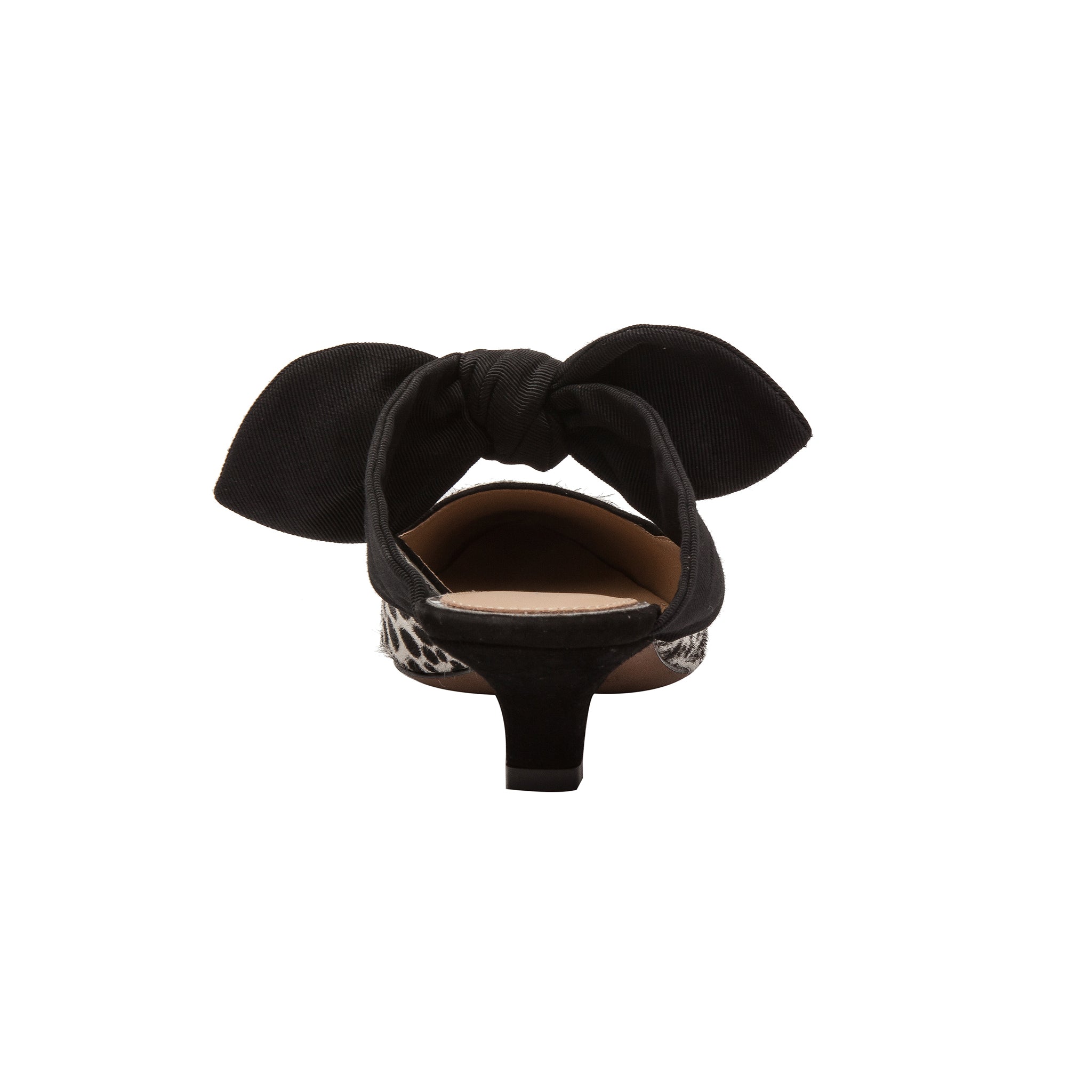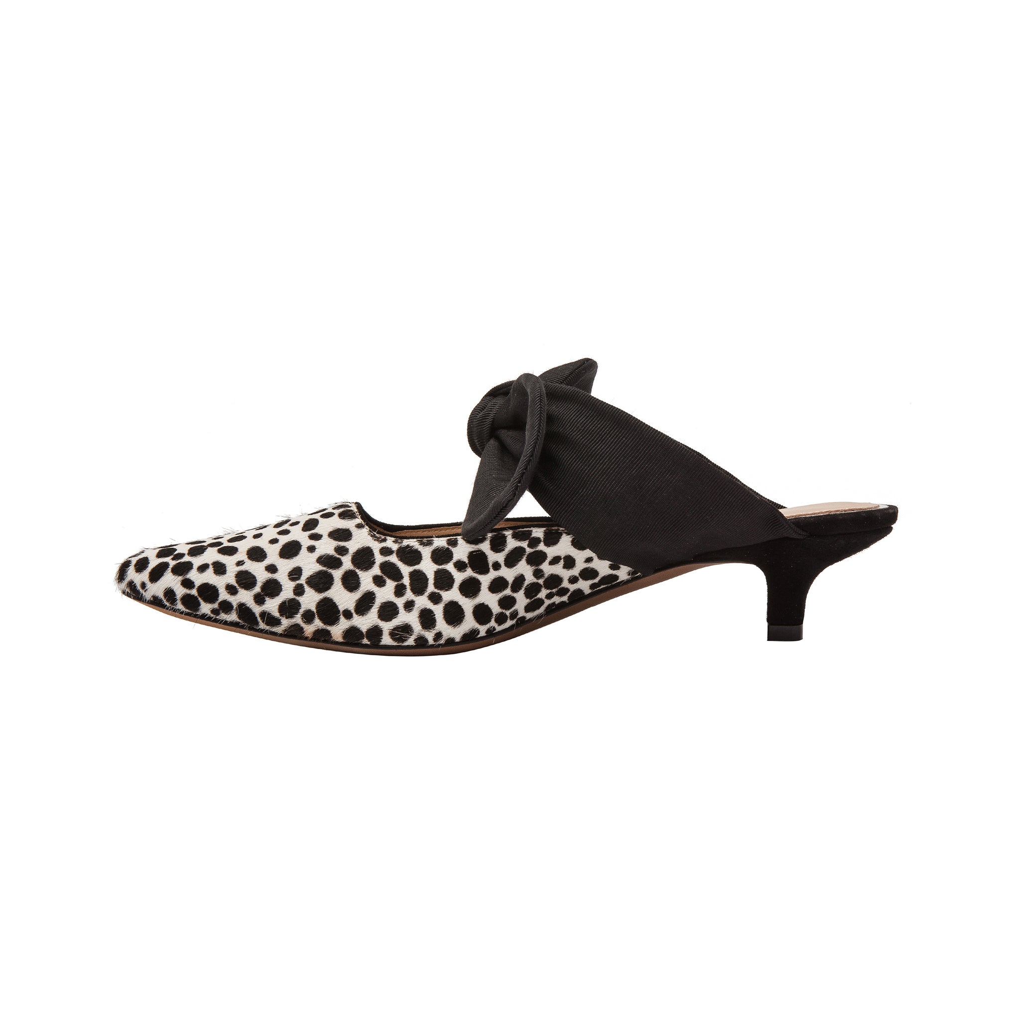 Meet CRISSY II | A feminine take on the kitten heel slide detailed with a knotted bow-adorned instep and tailored cap toe in luxe hair calf